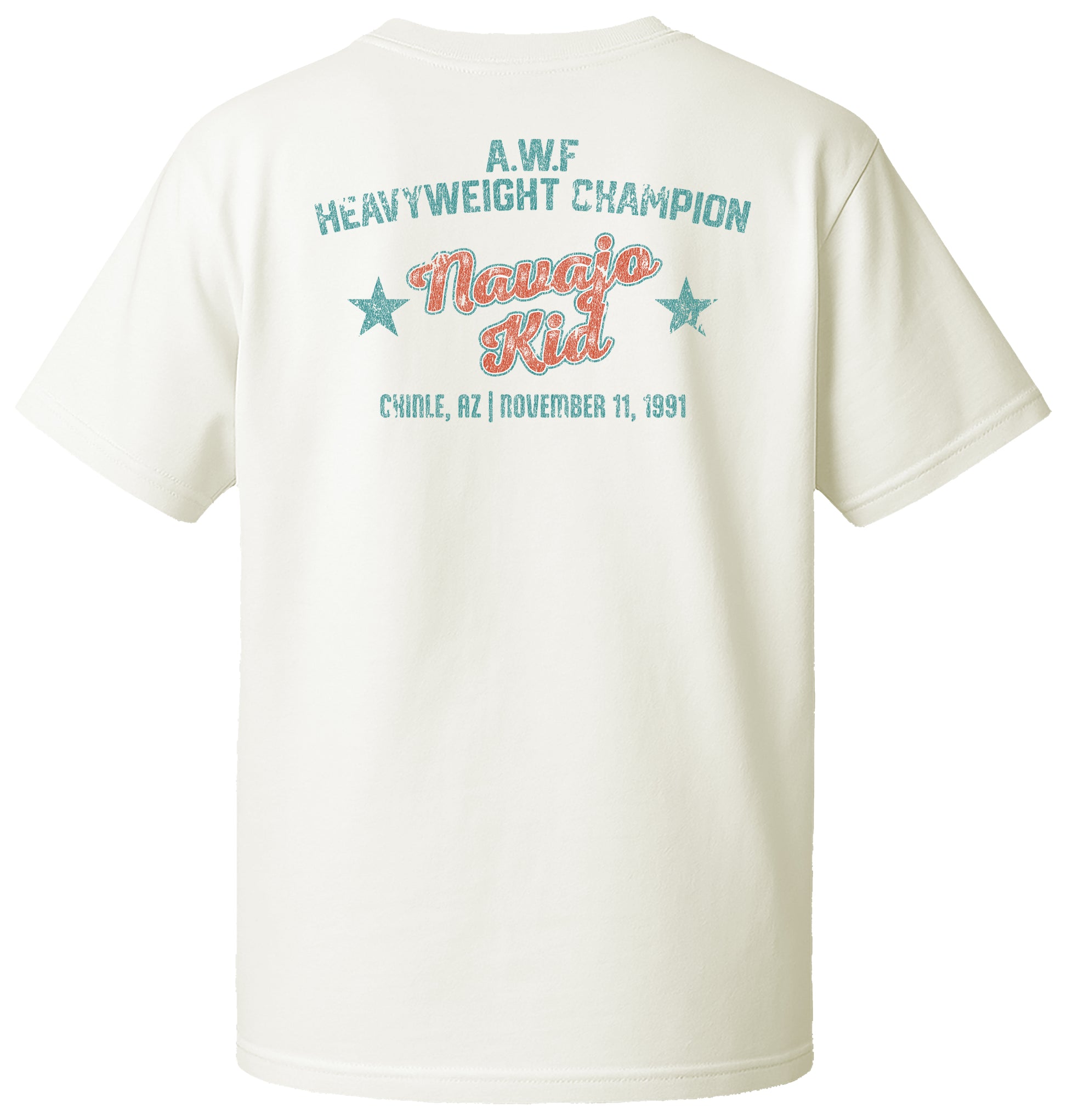 Before he became the Navajo Warrior, he stepped into the spotlight as the Navajo Kid. A young and hungry warrior ready to carve his name into wrestling history. This tee commemorates the moment it all changed: November 11, 1991, the night he captured the A.W.F Heavyweight Championship in Chinle, AZ.